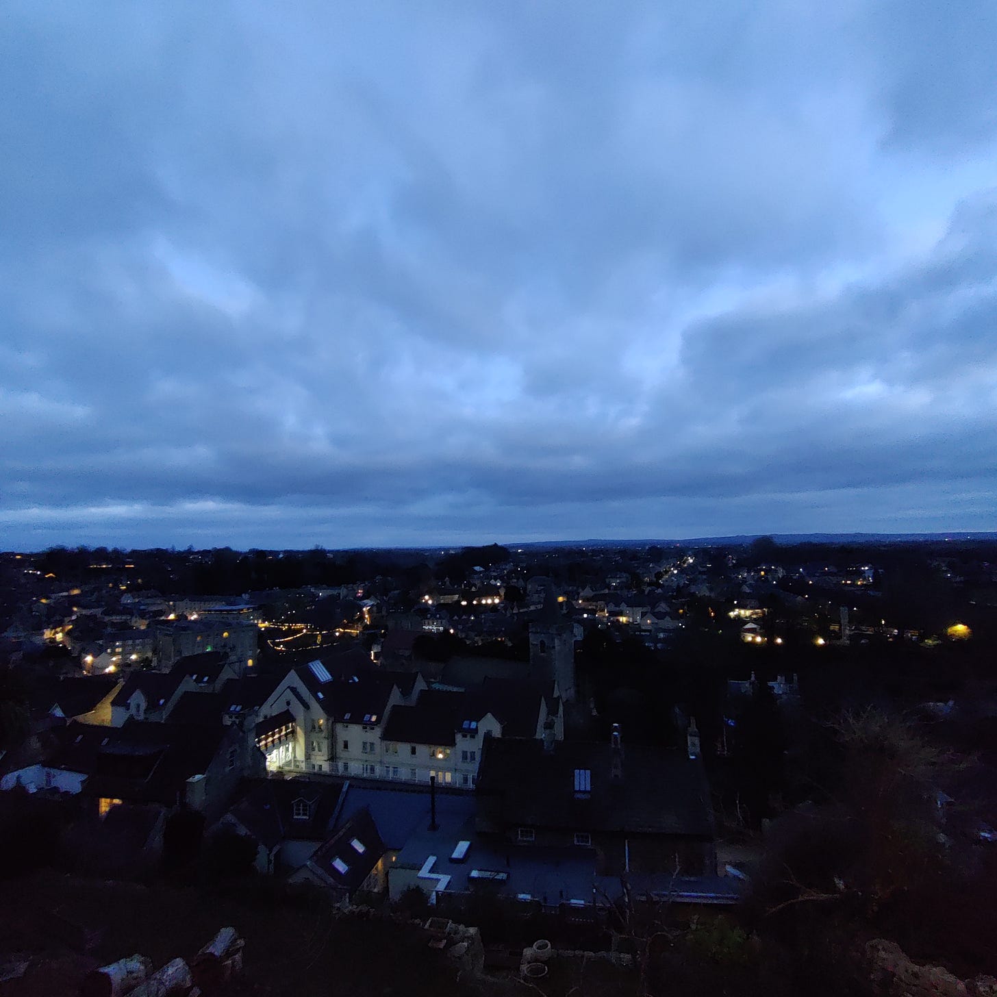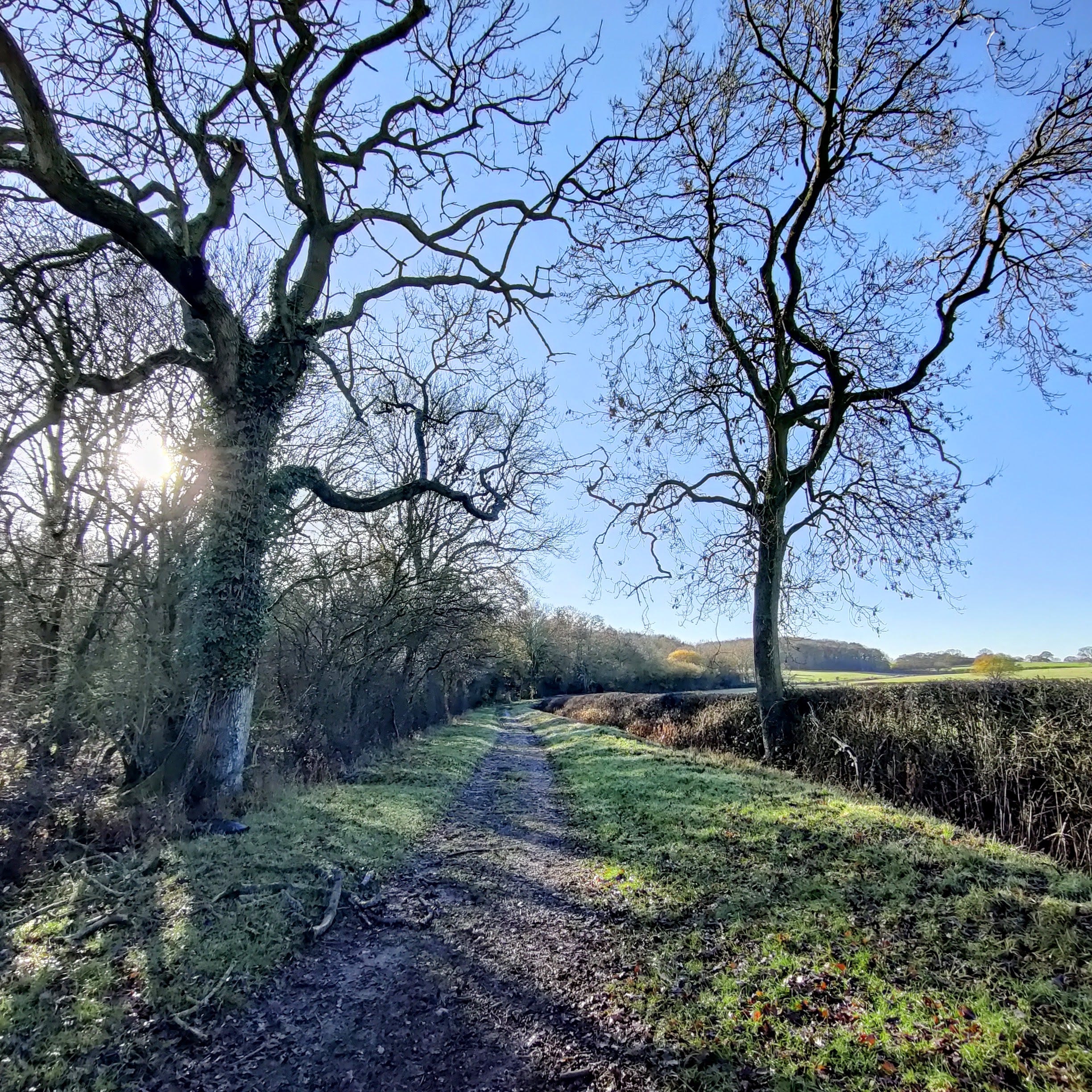 Grey, a bit drizzly, but brightened by golden moments. The road downhill from Henley is still lined with leaves, orange, brown, a wall of colour against winter’s gloom. Late afternoon low sun, watercolour amber. After dark, robins still chattering.